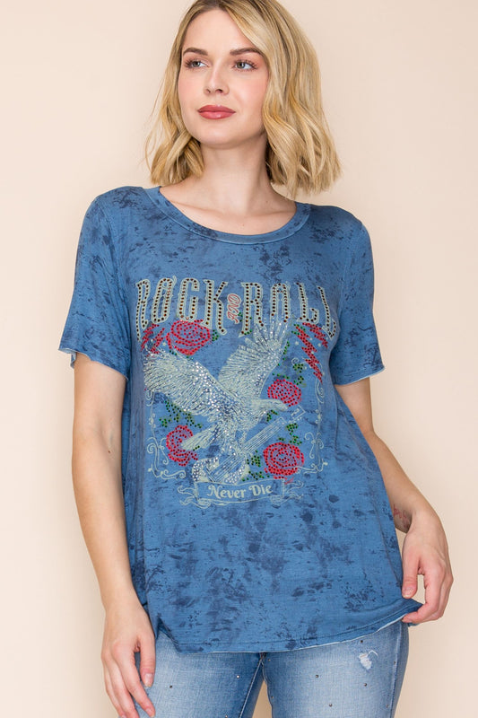 Edgy graphic tee with rhinestones rock ‘n’ roll never die