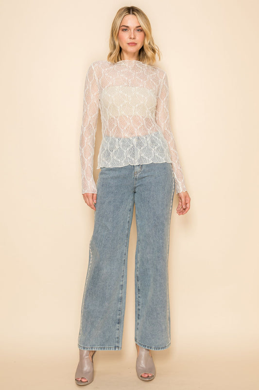 Mock neck, long sleeve lace top three colors available