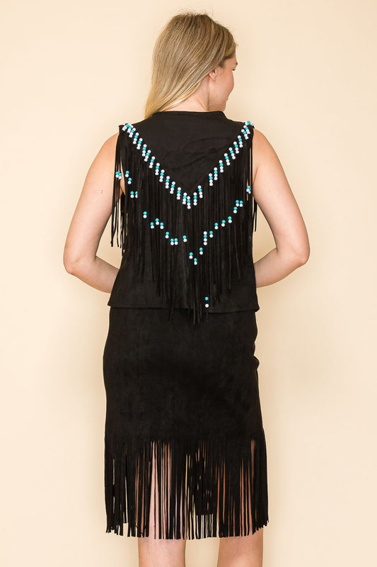Black beaded fringe suede vest with turquoise colored and multicolored beads