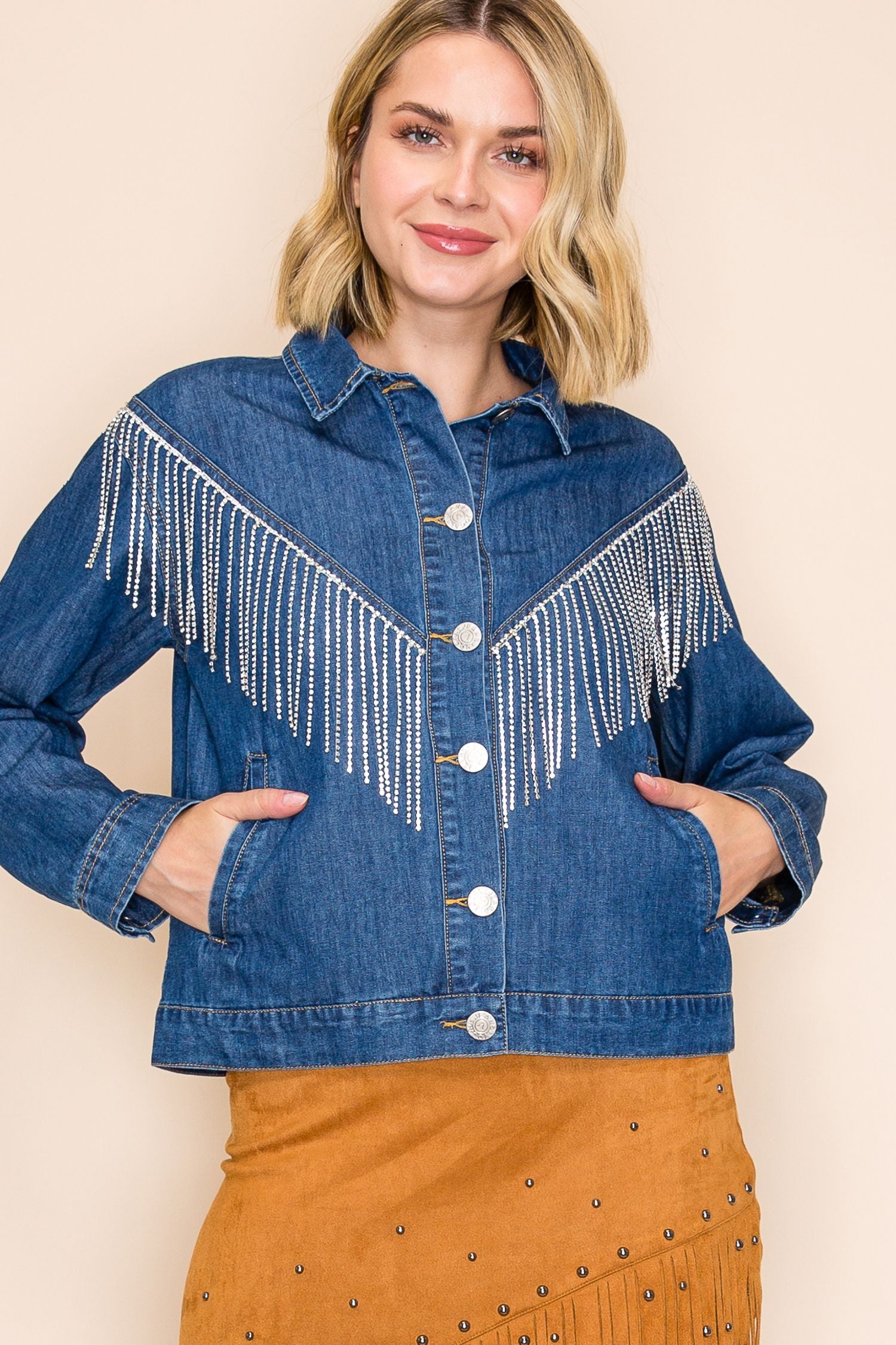 Rhinestone deep detail at V-neckline
