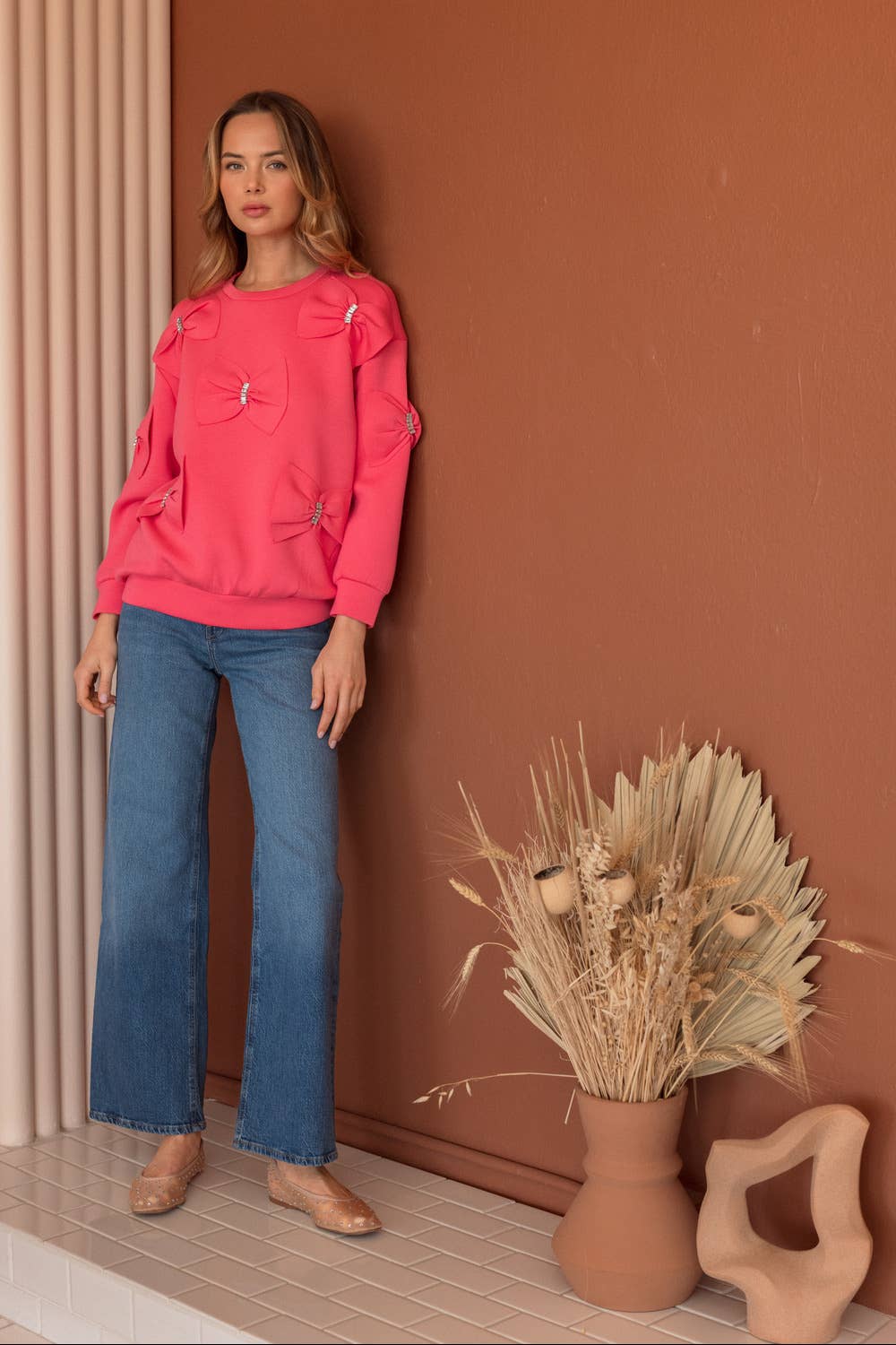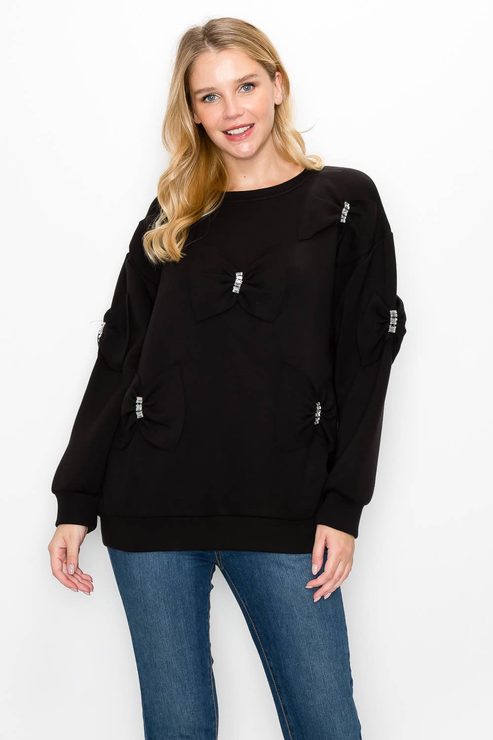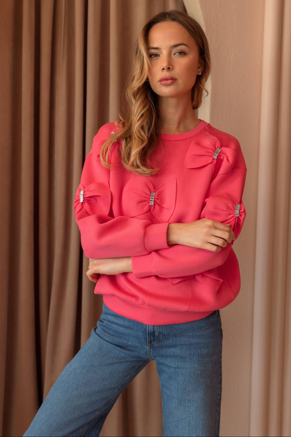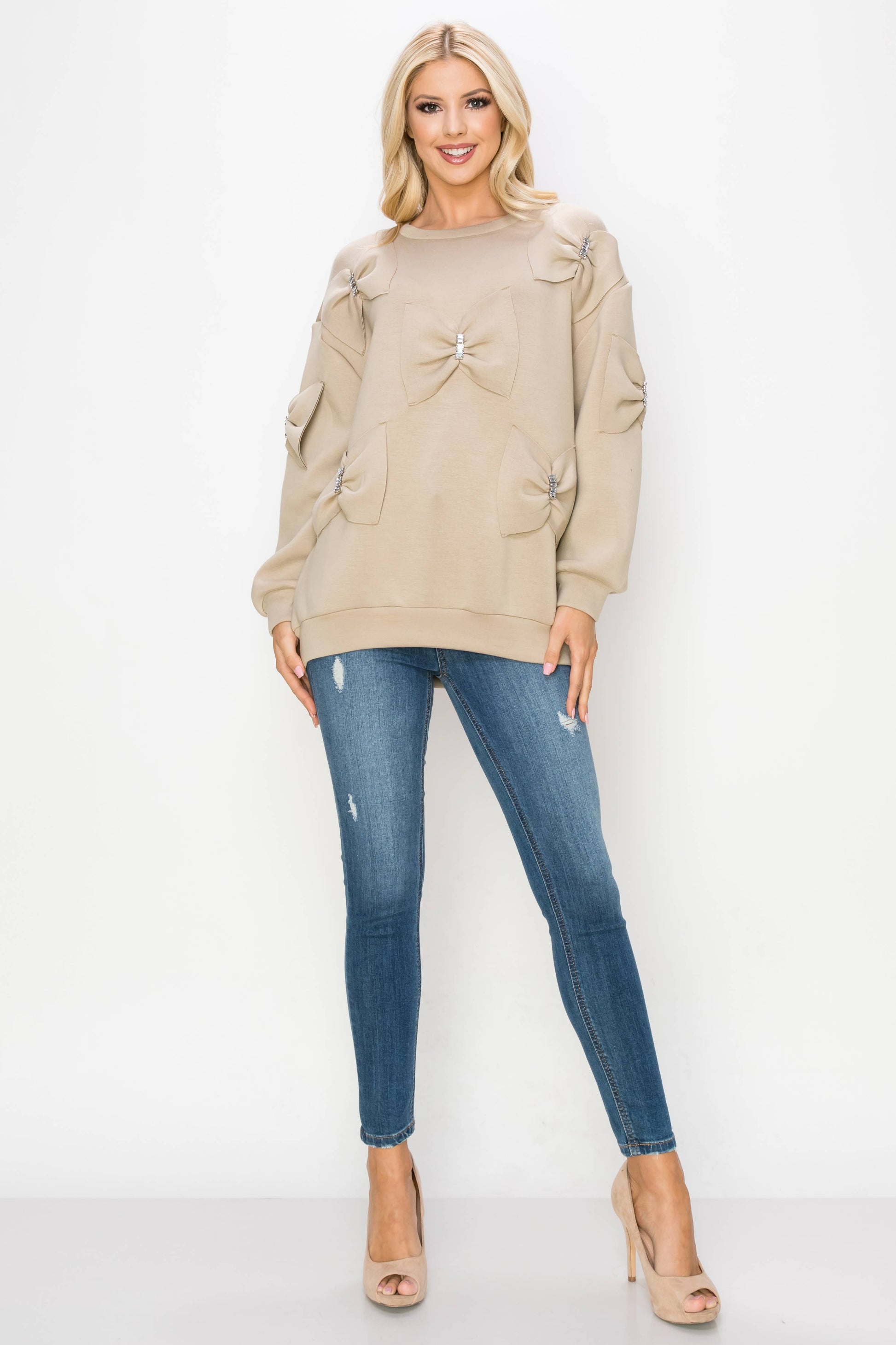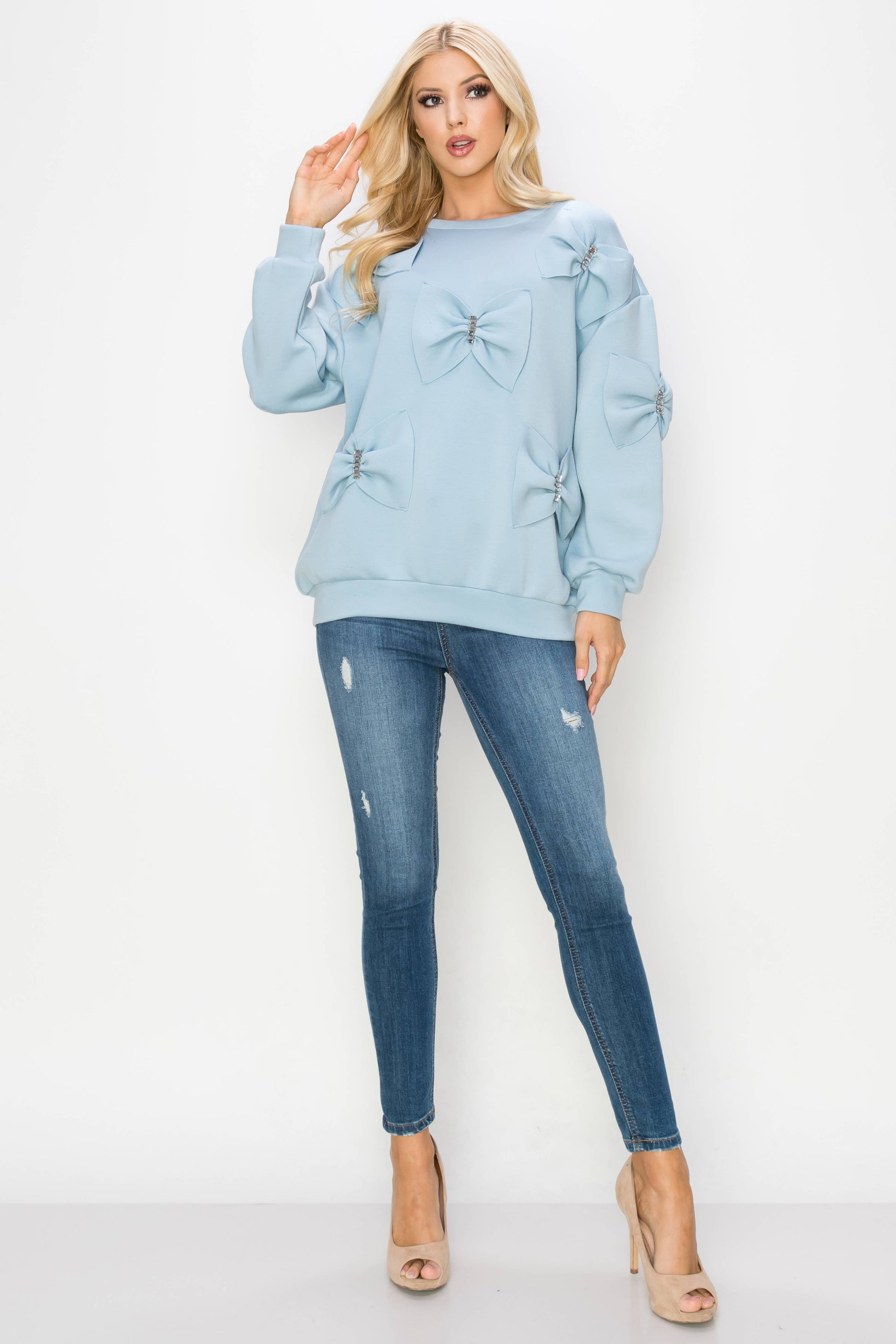 Our Fiora ribbon bow top. Made beautifully with french scuba fabric. Round neck and long sleeves. Easy relax loose fit. Stylish and comfy. Truly one of a kind ! Statement piece.