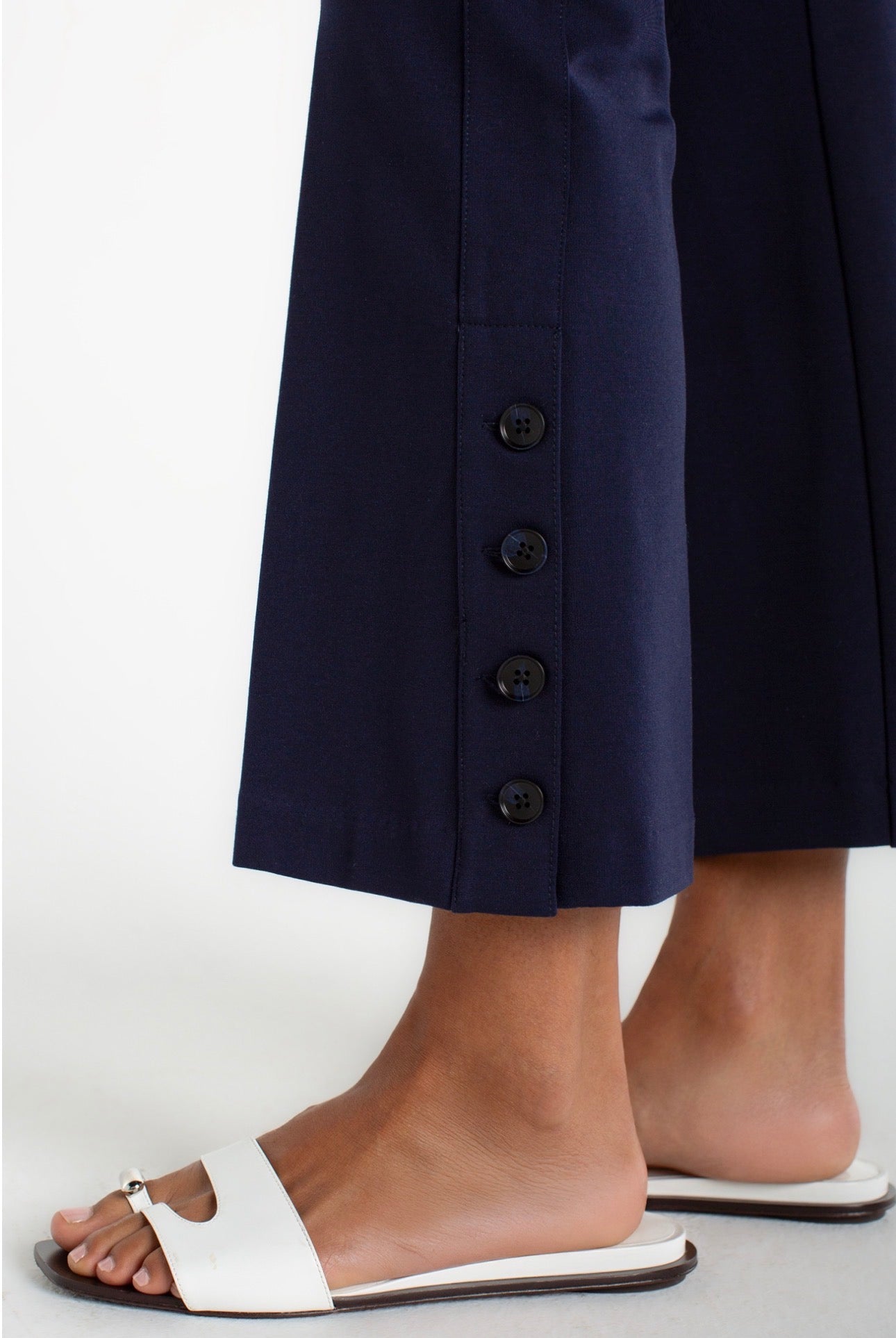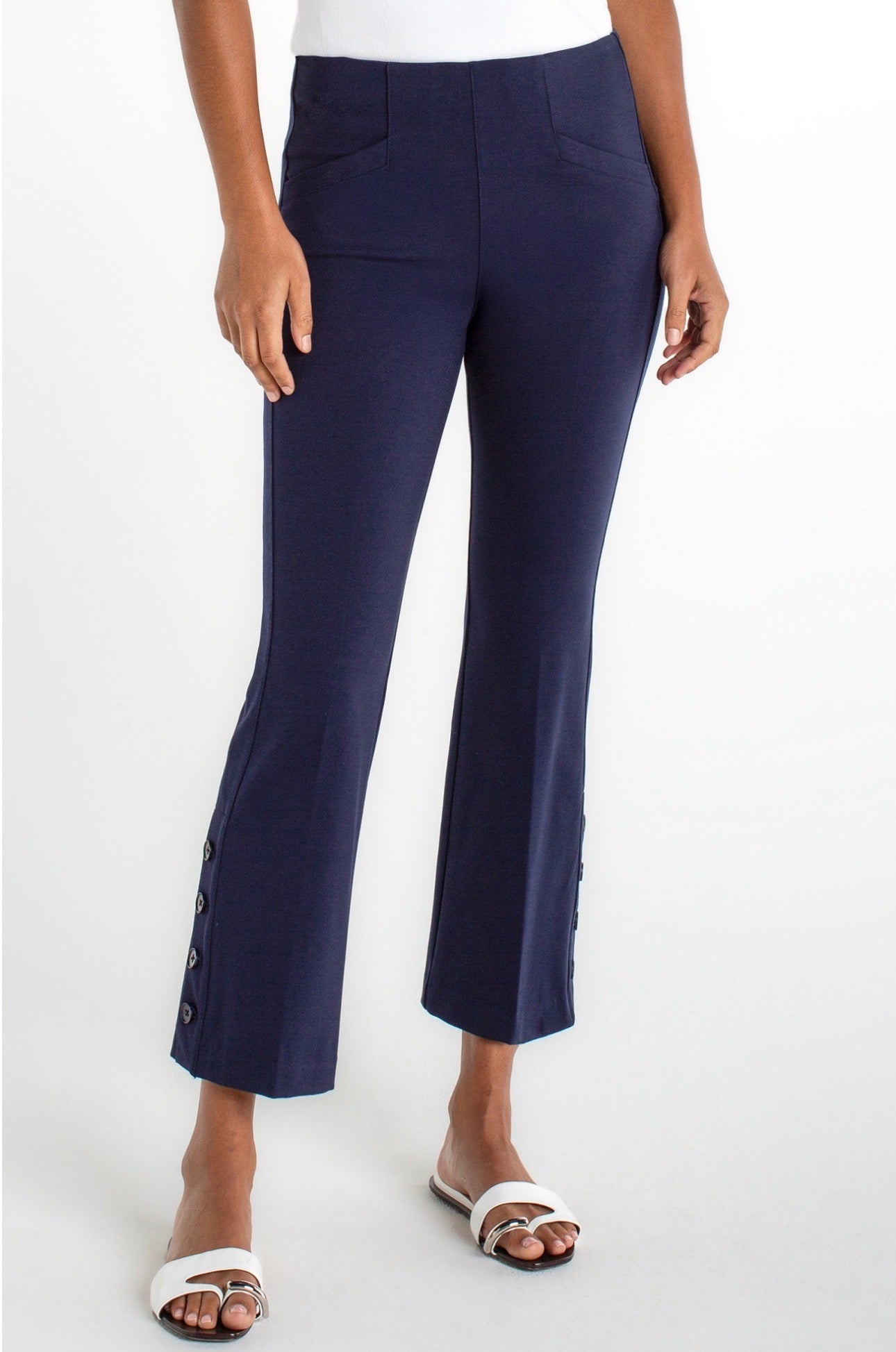 The Stella Pullon Kick Flair, measuring 27 inches, features a stylish cadet blue color and a unique flare design. The cropped buttons at the bottom enhance visual appeal, providing a sophisticated touch. This versatile piece can elevate various outfits, making it a valuable addition to any wardrobe. LM4725M42